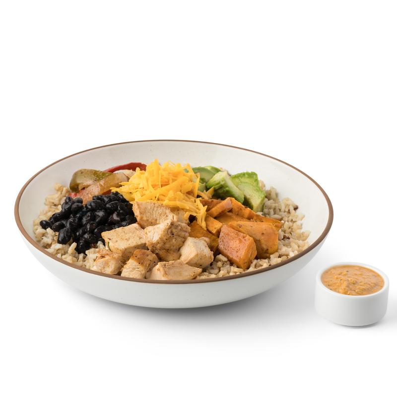 Choice of Base, Black Beans, Rosemary Sweet Potato, Fajita Veggies, Cheddar, Avocado, Zesty Texmexas Sauce