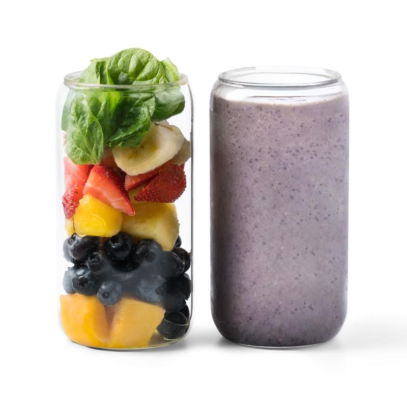 Almond milk, organic blueberry, organic strawberry, pineapple, mango, banana, organic spinach.