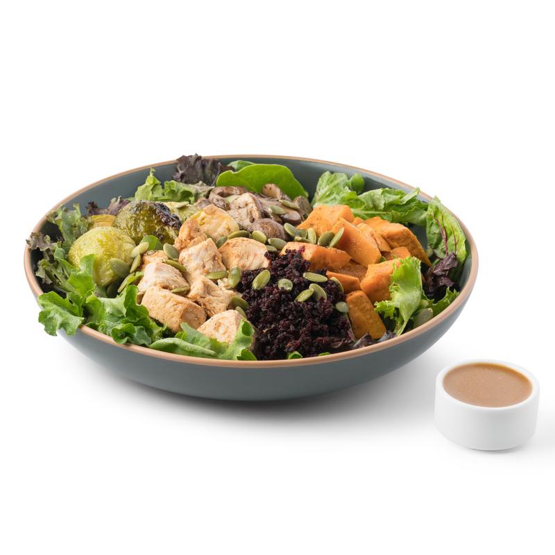 Rosemary sweet potato, roasted beet, basil mushroom, maple brussels sprout, pumpkin seed, miso vinaigrette.